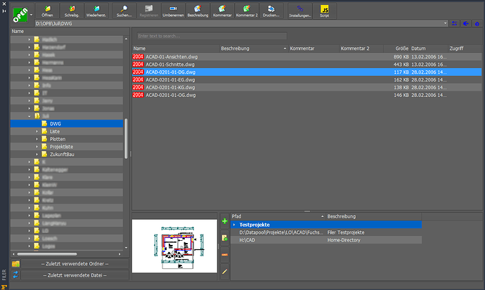 Filer is a file manager in AutoCAD with a much wider range of functions than the original one available in AutoCAD. It also has a built-in JavaScript interpreter so that it can be adapted to project-specific requirements.