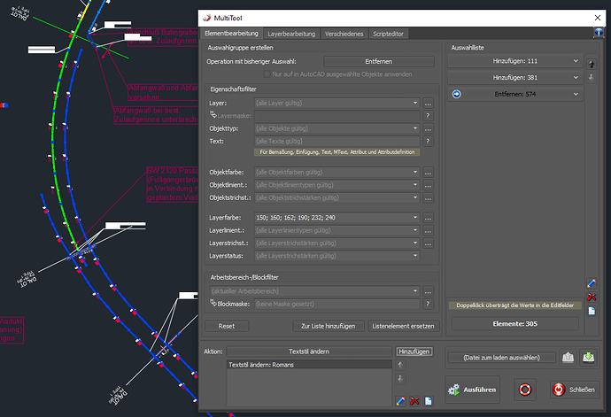MultiTool is a tool for selecting geometry in AutoCAD using various filter criteria and then modifying it. The filter results can also be linked using Boolean operations (and, or, xor, etc.). Additionally, a Lua interpreter is built in for even more specialized filter operations.