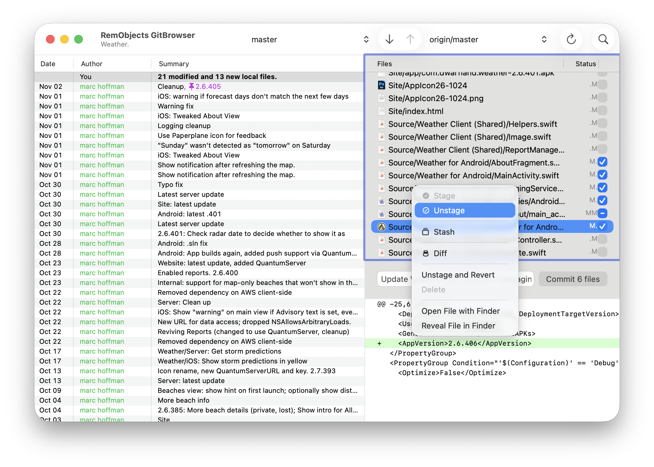 The detail pane on the right, finally, gives you all the information about the current commit, or the staging area, which shows you all local changes waiting to be committed. An embedded diff view gives you a quick glance at the changes to each of the files.