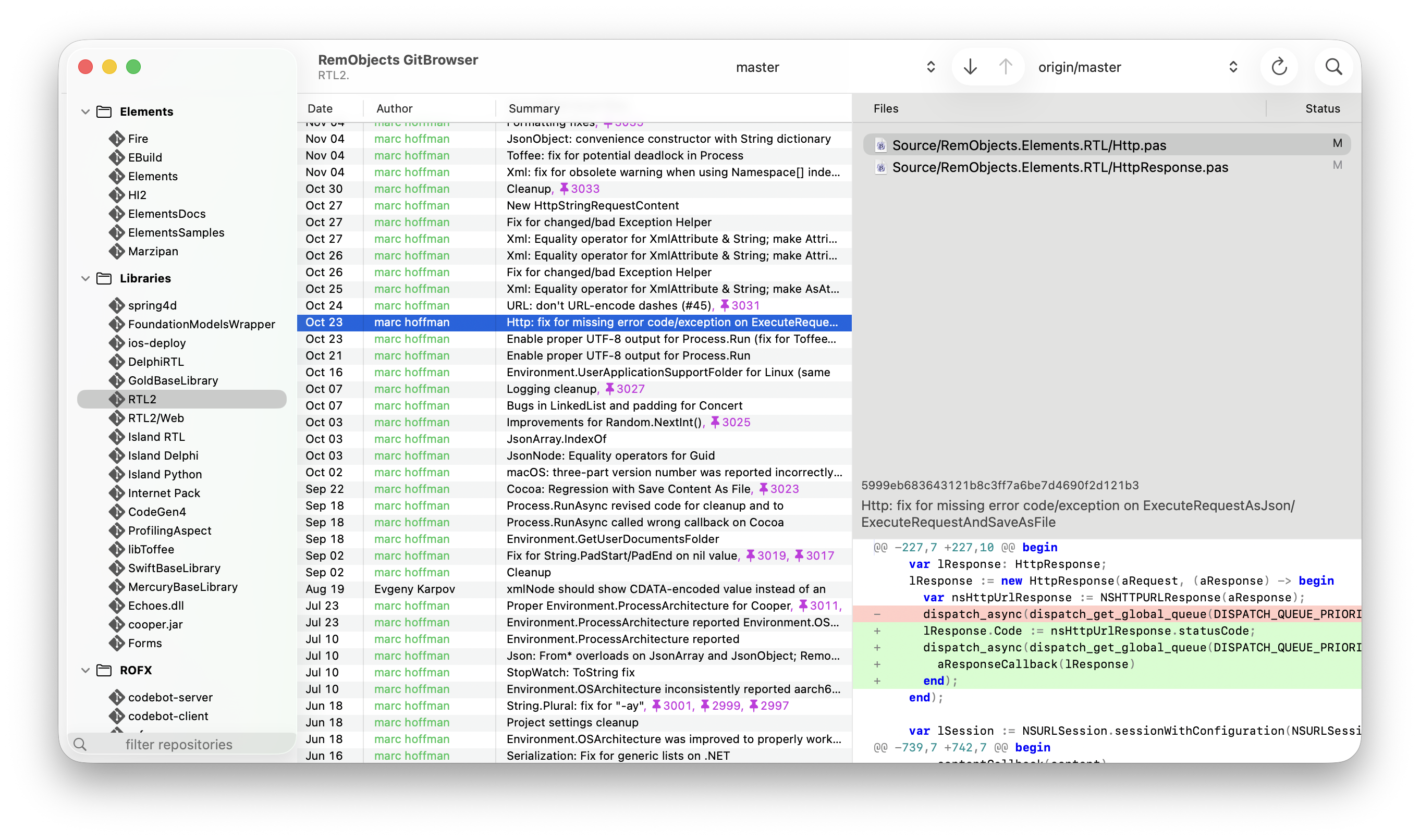 GitBrowser is a new, state-of-the-art Git frontend from RemObjects. Targeted at both novice and experienced Git users, GitBrowser makes it easy to keep up to date with and work on many repositories, with an intuitive and easy-to-use interface for most version control-related tasks.